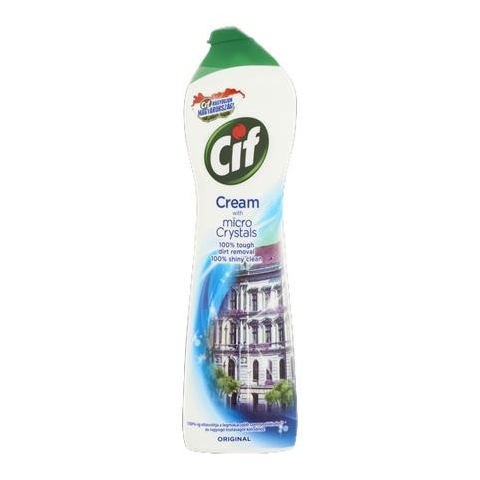 Cif Orginial súrolókrém karcmentesen tisztító folyékony súrolószer. Alkalmazható konyhában és szaniter helyiségekben minden kemény és érzékeny felület karcmentes tisztítására, legyen az akár rozsdamentes acél-, kerámia- vagy zománcozott felület (pl. tűzhely, edények, mosdókagyló). Eltávolítja az olyan makacs szennyeződéseket, mint a leégett ételmaradványok, zsíros szennyeződések, szappan- és vízkőlerakódások, és kellemes citrom illatot hagy maga után