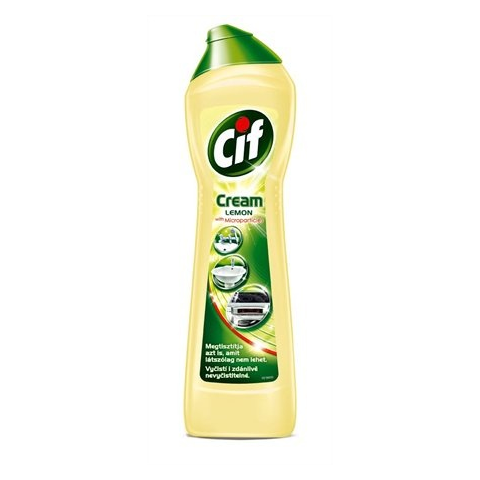 Cif Lemon súrolókrém mikrokristályokkal. Eltávolítja a makacs szennyeződéseket is a 100% ragyogó tisztaságért. Áthatol a legmakacsabb szennyeződéseken, mint az odaégett zsírfoltok és ételmaradékok, fürdőszobai vízkő lerakódások állagának köszönhetően könnyű leöblíteni, így hamar élvezheti a tökéletesen ragyogó tisztaságot. A mikroszemcsék hatékonyságának jóvoltából kis erőráfordítással újszerűvé varázsolhatja kedvenc tárgyait. Használható