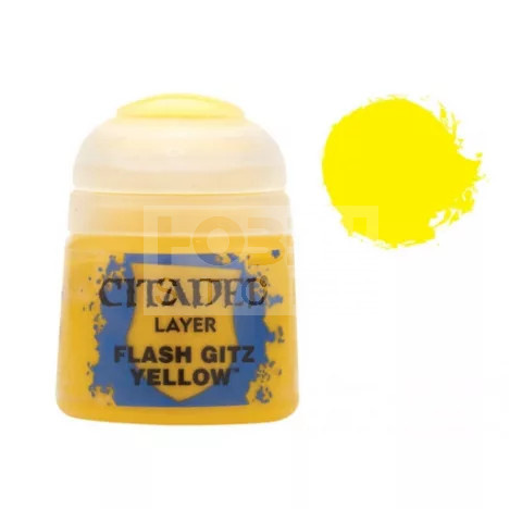 Citadel Colour Layer - Flash Gitz Yellow 12 ml akrilfesték 22-02 A Citadel Layer akrilfestékek a Citadel festékcsalád legnépesebb tagja, több mint 90 féle árnyalat áll rendelkezésünkre. Alkalmazása elsősorban a Citadel Base festékrétegre javasolják híg
