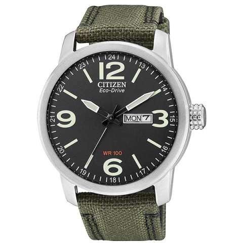 Karóra férfiaknak - analóg idő megjelenítés, napelemes, kerek számlap, dátum, a hét napja és fényvisszaverő elemek, Citizen Eco-Drive sorozat, sportos, arab indexek, ásványi számlap, 100 m (10 ATM) vízhatlanság, a tok anyaga acél, a tok színe ezüst, a szíj anyaga nejlon, a szíj színe zöld A klassz CITIZEN Classic BM8470-11EE férfiaknak karóra alkalmas mindennapi viseletre. Az alapját egy 42 mm-es kerek számlap képezi. A kitűnő CITIZEN Classic BM8470-11EE karóra k