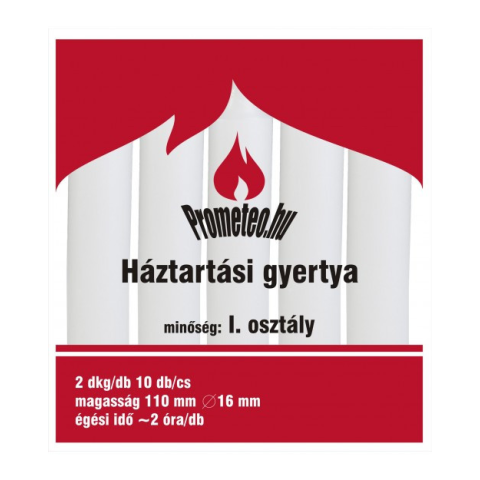 Fehér színű gyertya csomag 10 db-os kiszerelésben. Súlya: 2 dkg/db. Magassága: 11 cm, átmérője: 1,5 cm. A feltüntetett ár 10 db/cs - ra értendő!