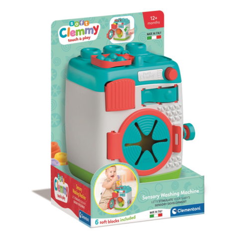 Mosógép készségfejlesztő játék Clementoni Doboz mérete: 22x33x17 cm - Színes, puha anyag kockák (6 db) - A fogantyú segítségével forgatható a dob, benne a kockák - A játék kitűnően fejleszti a szem-kéz koordinációs képességet és a finommotorikus készség