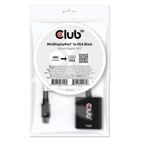 Club 3D Átalakító - CAC-2113 (Mini DisplayPor 1.1a to VGA, fekete, aktív, 1920x1200@60Hz, kompatibilis AMD/Nvidia/Intel) A Club 3D CAC-2113 aktív MiniDisplayPort™ - VGA jelátalakító. Lehetővé teszi, hogy analóg VGA televíziókat, monitorokat vagy projek