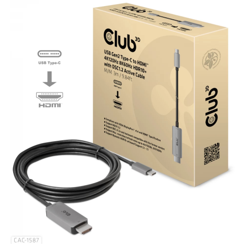 USB Gen2 Type-C – HDMI 4K120Hz 8K60Hz HDR10 DSC1.2 aktív M/M 3m / 9.84ft kábellelA Club 3D CAC-1587 USB Gen2 Type-C – HDMI™ 4K120Hz 8K60Hz HDR10+ DSC1.2 Active M/M 3m/9.84ft. kábellel, tökéletes megoldás bármilyen HDMI™ 8K60Hz* vagy 4K120Hz kész kijelzőhöz való csatlakoztatáshoz. Ha DisplayPort™ Alt Mode 1.4-re kompatibilis számítógépe van USB Gen2 Type-C csatlakozással, vagy bármilyen más eszköze van, amely nem rendelkezik az új HDMI™ 8K60Hz vagy 4K120Hz spec