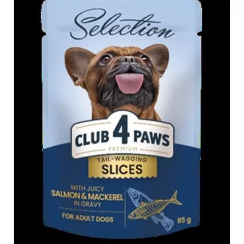 CLUB 4 PAWS Premium Plusz Alutasakos Válogatás Lazaccal és Makrélával Szószban 85g kutyaeledel termékleírás