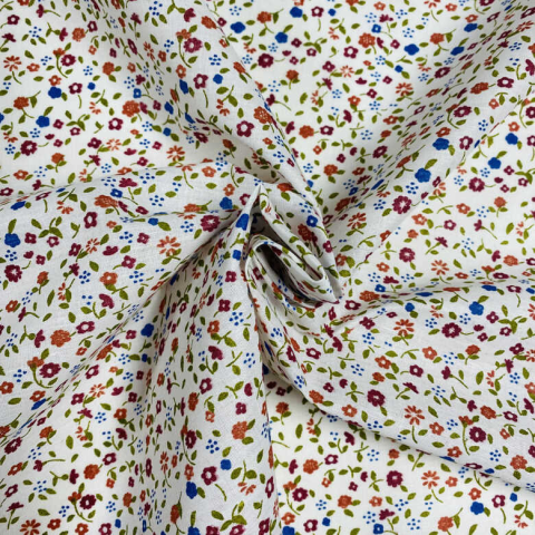 35% pamut - 65% poliészter méteráru. 140 cm széles. Minimum rendelhető mennyiség: 1 méter. 140 cm széles, pamut-poliészter, kevertszálas vászon anyag. Összetétel: 35% pamut - 65% poliészter. Fehér alapon bordó, narancs, kék, zöld apró virágminta. Fe
