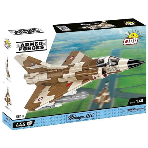 444 darabos, 1:48 méretarányú Cobi Mirage IIIC - francia vadászgép építőjáték készlet 1 figurával. Az összeépített vadászgép 29 cm hosszú, 17,5 cm széles és 12 cm magas. A pilótafülkébe a figura be van ültetve, bizonyos szárny részek állíthatóak. A kész