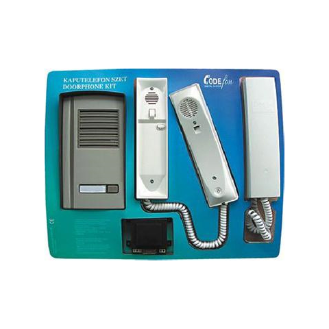 CODEFON 1 lakásos kaputelefon szett 2 lakáskészülékkel, 1 kültéri egységgel, transzformátorral és esővédővel A kaputelefon főbb jellemzői 1+n vezetékes kaputelefon szett. 1 db kültéri egység. 2 db lakáskészülék. 1 db transzformátor (VF-TR20A). Műanyag, falon kívül szerelhető kültéri egység. Kellemes, elektronikus csengőhang. Elektret mikrofon. Fóliamembrános hangszóró (8 ohm/0.5 W). Elektromos ajtózár vezérlő kimenet (12 VAC, maximum 1.2