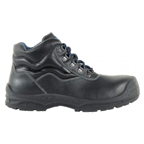 S3 védelmi képességgel rendelkező munkavédelmi bakancs kompozit orrmerevítővel és atp talpátszúrás elleni védelemmel. PU/TPU talp kopásálló talp. Kivehető kényelmi talpbetét. Cofra Genk S3 SRC Védőbakancs Fekete bőr védőbakancs világoskék szövet bels