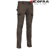 Cofra derekas munkásnadrág kevertszálas anyagból. Anyaga: 60%Pamut-37%Poliészter-3%Elasztán,245 g. A nadrágon található két első zseb, patenttal záródó két hátsó zseb,szerszámtartó hurok. Bal szárzseb patenttal és zippzárral záródik, jobb szárzseb paten