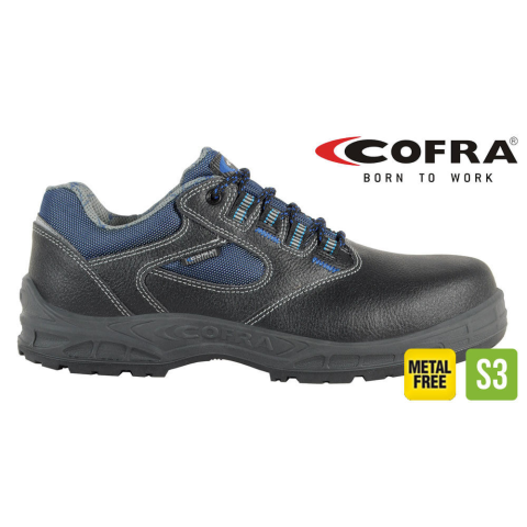 Cofra, fekete bőr munkavédelmi cipő, szürke szövettel. Felsőrésze vízlepergető préselt bőr és lélegző szövet kombinációja. Drytherm légáteresztő belső bélés. Eneriaelnyelő sarokrésszel rendelkezik. EN ISO 20345:2011 Fekete bőrből készült cofra munkav