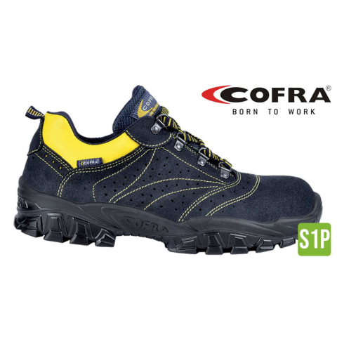 Kék velúrbőrből készült oldalán lyukacsozott, jól szellőző munkavédelmi cipő acél kaplival és acél talplemezzel. Sportos, modern kivitel, egyedülálló mintázatú Cofra talppal. Kivehető kényelmi talpbetéttel. Cofra New Arno S1P SRC Munkavédelmi Cipő K