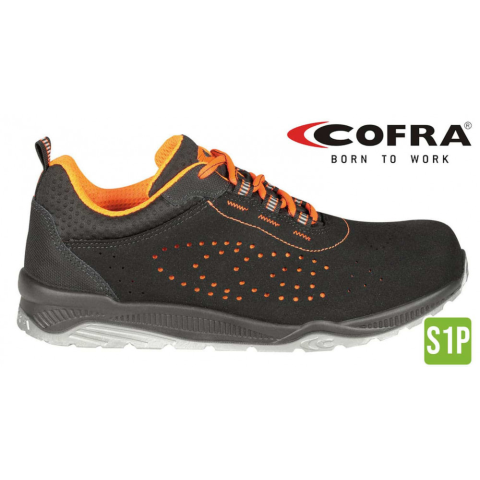 Perforált velúrbőr felsőrésszel készült fekete színű munkavédelmi cipő, narancssárga belső béléssel. A cipő jól lélegző, kényelmes kialakítású, S1P védelmi képességű, amely tartalmazza az alumínium kaplit és az APT átszúrás elleni védelmet nyújtó köztalpa