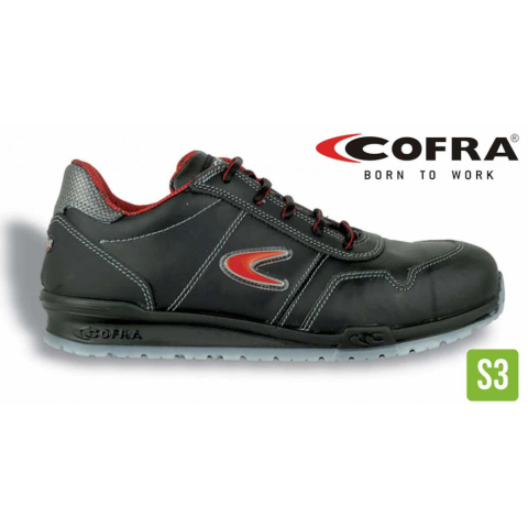Fekete munkavédelmi cipő bőr felsőrésszel, piros Cofra logóval az oldalán, piros belső szövet béléssel. Felső része vízlepergető, talpa kopásálló. Alumínium kapli és APT talpátszúrás elleni védelem felel a védelemért. S3-as védelmi képesség! Cofra Zato