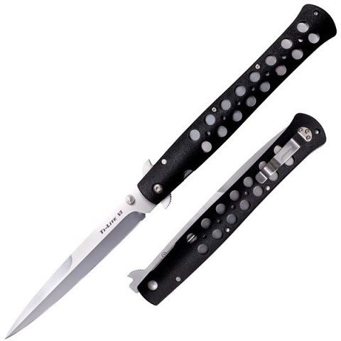 Zsebkés - zárható, mindennapos (EDC), acél keménysége 63 HRC, markolat anyaga műanyag, penge hossza 15,2 cm, kés teljes hossza 33 cm, tömege 213 g A Cold Steel Ti-Lite 6" Zy-Ex™ egy összecsukható kés, amelyet az ikonikus 50-es évekbeli olasz tűsarkú cipők ihlettek. Karcsú sziluettjének, hosszú pengéjének és gyors nyitómechanizmusának köszönhetőe