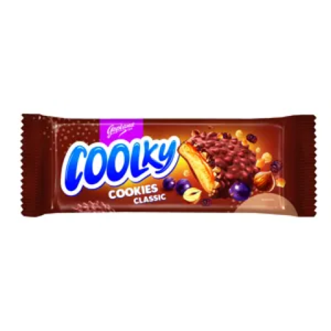 Coolky Cookies Classic 140 gTejcsokoládéval bevont keksz karamellával, gabonapehellyel, mogyoróval és mazsoláv