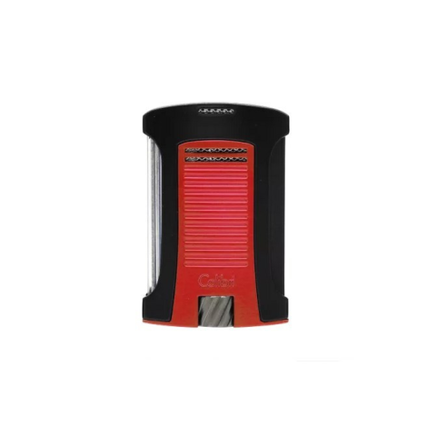 Erős egyes Jet lángos Colibri Daytona Black szivaros öngyújtó klasszikus piros színben az alján tölthető és a nagy méretű láng állító kerékkel könnyedén tudjuk szabályozni a láng méretét, az oldalán egy hatalmas gáz tartállyal aminek a belső fele kék színű így könnyedén tudjuk ellenőrizni a töltöttségi szintet. A piezo gyújtást és a fúvókákat egy záró fedél védi a szennyeződésektől amin a Colibri logója látható, akár 3500 méteres magasságig