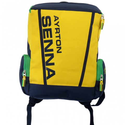 Ayrton Senna hátitáska, az elején Ayrton Senna neve látható, egy nagyobb rekesszel rendelkezik az elején és mindkét oldalán egy kisebb cipzáras zseb látható. A bal oldali zseben megtalálható Ayrton Senna aláírása. Anyaga: 100% Poliészter. Méret: Egy mére