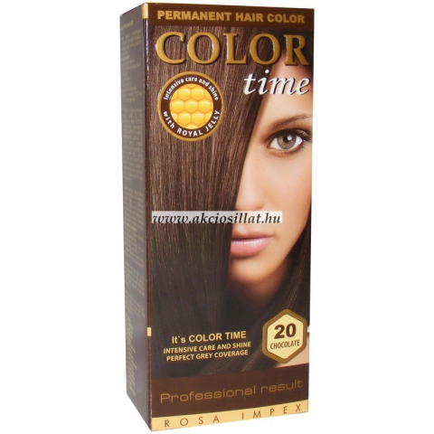 Color Time hajfesték csokoládé 20 Color Time hajfesték tartós hajfesték méhpempővel. A méhpempő regenerálja, hidratálja és vitalizálja a hajat, csillogást és intenzív ápolást nyújt. A Color Time gél formula hihetetlen színállóságot biztosít. Szín pigm