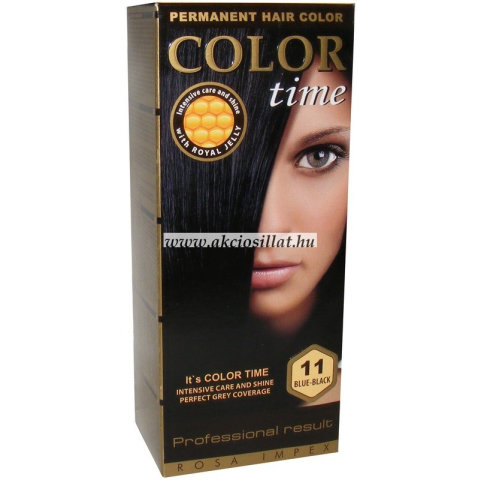 Color Time hajfesték kékes fekete 11 Color Time hajfesték tartós hajfesték méhpempővel. A méhpempő regenerálja, hidratálja és vitalizálja a hajat, csillogást és intenzív ápolást nyújt. A Color Time gél formula hihetetlen színállóságot biztosít. Szín p