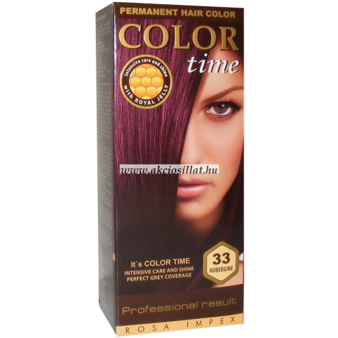 Color Time hajfesték padlizsán 33 Color Time hajfesték tartós hajfesték méhpempővel. A méhpempő regenerálja, hidratálja és vitalizálja a hajat, csillogást és intenzív ápolást nyújt. A Color Time gél formula hihetetlen színállóságot biztosít. Szín pigm