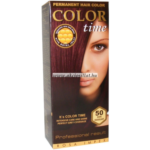 Color Time hajfesték sötét mahagóni 50 Color Time hajfesték tartós hajfesték méhpempővel. A méhpempő regenerálja, hidratálja és vitalizálja a hajat, csillogást és intenzív ápolást nyújt. A Color Time gél formula hihetetlen színállóságot biztosít. Szín