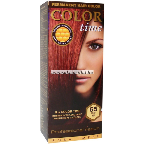 Color Time hajfesték tűzvörös 65 Color Time hajfesték tartós hajfesték méhpempővel. A méhpempő regenerálja, hidratálja és vitalizálja a hajat, csillogást és intenzív ápolást nyújt. A Color Time gél formula hihetetlen színállóságot biztosít. Szín pigme