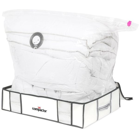 Vákuumzsák - levegő kiszívása szívószeleppel, mérete 65 × 50 cm (Sz×H), űrtartalma 145 l, anyaga műanyag és textil A Compactor Life vákuumzsák lehetővé teszi a tárgyak intelligens és praktikus tárolását. Megtakarítja a tárolóhely akár 75%-át, miközben védi a ruhákat, paplanokat és párnákat a külső hatásoktól, péld