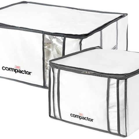 A Compactor Life vákuumos tárolódoboz készlet 1x M 125 liter, 1x XL 190 liter intelligens megoldást kínál a terjedelmes textíliák tárolására. A ruhákat, takarókat vagy párnákat a légmentesen záródó zsákokba helyezve és a levegőt kiszívva akár 75%-kal több helyet nyerhet. A készlet két különböző méretű dobozból áll, amelyeket úgy terveztek, hogy lehetővé tegyék a tiszta, higiénikus és hosszú távú tárolást a nedvesség, penész vagy por okozta agg