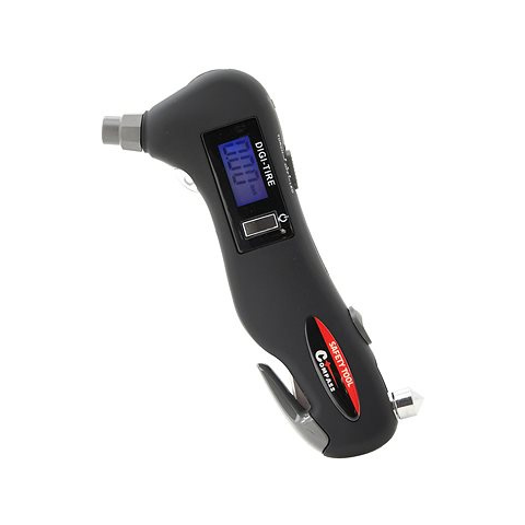 Keréknyomás mérő - digitális, kompatibilis Schrader szelepekkel, megjelenített mértékegységek Bar, nyomásmérés 0,1 - 10 bar között, háttérvilágítású kijelző, kalapács, elemlámpa és kés a csomagban, műanyag konstrukció, AAA elem (nincs mellékelve) Az optimális guminyomás hozzájárul a biztonságos és kényelmes utazáshoz, valamint a gumiabroncs mintázatának megfelelő kopásához. A SAFETY TOOL guminyomásmérő a nyomást a háttérvilágításs