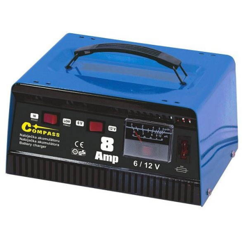 Autó akkumulátor töltő - 6 V és 12 V -os töltési feszültség, az akkumulátor PbCa, elárasztott (PbWet) típusú, 0,85 - 8 A közötti töltőáram, 3,7 - 80 Ah közötti kapacitású akkumulátor töltésére alkalmas, 8,5 V minimális feszültségű akkumulátorhoz, 2 üzemmóddal, normál és gyors töltési móddal, 3,07 kg tömegű, töltőkábel hosszúsága 1,95 m, krokodil kapcsok a csomag része Profi és tartós Compass márkájú töltő a 6V vagy 12V, 3,7-80 Ah kapacitás