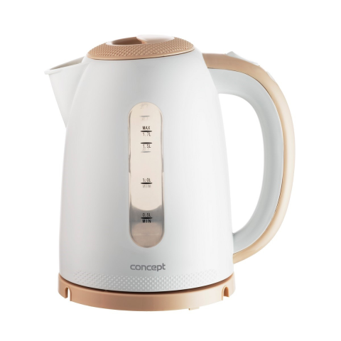 Vízforraló - űrtartalma 1,7 l, fehér kivitel, 2200 W energiafogyasztás, rejtett spirál, vízszint jelző, kivehető szűrő, anyaga műanyag A Concept RK2331 egy praktikus fehér és bézs színű vízforraló, amely néhány pillanat alatt felmelegít akár 1,7 liter vizet is, hogy Ön friss forralt vízből készíthessen teát v