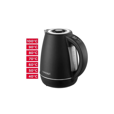 Vízforraló - rozsdamentes, űrtartalma 1,7 l, fekete kivitel, 2200 W energiafogyasztás, szűrő, forgótalp és rejtett spirál, automatikus kikapcsolás, túlmelegedés és víz nélküli működés elleni védelem, hőmérséklet megtartása, kivehető szűrő Ezen 1,7 l-es Concept Vízforraló lehetővé teszi a tea és a kávé gyors és egyszerű elkészítését. A vízforralót rozsdamentes acélból készítették, nem tartalmaz olyan anyagokat, amelyek kedvezőtlen hatás