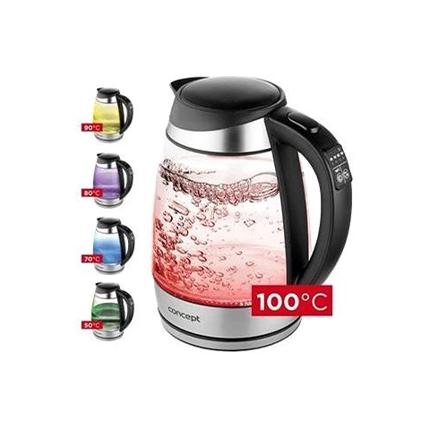 Vízforraló - hőmérséklet szabályozás, űrtartalma 1,7 l, fekete és ezüst kivitel, 2200 W energiafogyasztás, bemeneti feszültség 230 V, szűrő, LED világítás, forgótalp és rejtett spirál, automatikus kikapcsolás, működésjelző lámpa, túlmelegedés és víz nélküli működés elleni védelem, hangjelzés, hőbiztosíték, hőmérséklet megtartása, vízszint jelző, kivehető szűrő, anyaga üveg Ezen 1,7 lűrtartalmú Concept Vízforraló biztosítja az italok egyszer