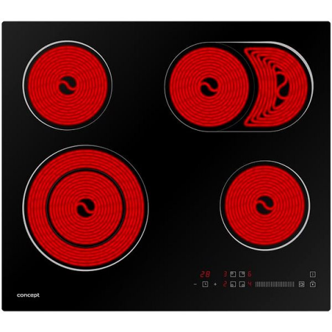 Főzőlap - kerámialapos, beépíthető, 4 főzőzóna, automatikus kikapcsolás, gyerekzár és maradékhő jelzés, hangjelzés és időzítő, érintéses vezérlés, függőleges élek, keret nélküli, fekete üveg kivitel, üveg felület, 230 V és 400 V csatlakozás, mérete 59 × 52 × 5 cm (Sz×Mé×Ma) Az elegáns Concept kerámia főzőlap segítségével gyorsan és egyszerűen elkészítheted kedvenc ételeidet. Az üvegkerámia főzőlap rendkívül népszerű, mivel költséghat