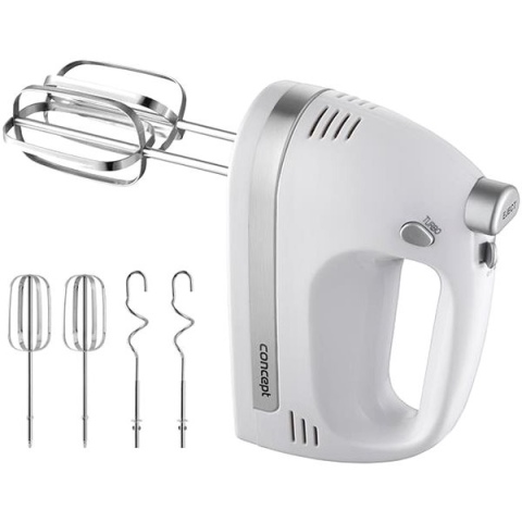 Kézi mixer - elektromos, 500 W teljesítmény, 5 sebességfokozat, dagasztókar és habverő a csomag része, rendeltetése dagasztás, keverés és habverés, tartozék kioldó gomb és ergonomikus markolat, mérete 19,5 × 19,5 × 9 cm (Ma×Sz×Mé), tömege 0,05 kg A szuper Concept kézi robotgép segítségével gyerekjáték lesz egy krém kikeverése vagy a tészta dagasztása. Bizonyára elnyeri a tetszésedet az intuitív vezérlőegység és a kompakt méret. 500 W teljesítm