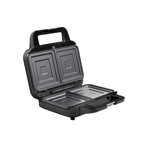 Szendvicssütő - 4 az 1-ben, cserélhető sütőlapok, 2 szendvics egyidejű készítéséhez, négyszög és háromszög sütőlapok, teflon felület, tapadásmentes felület, a csomagban található sütőlapok alkalmasak szendvicshez, gofrihoz, grillezéshez, túlmelegedés elleni védelem, zárható, hőszigetelt markolat és zsinór feltekerési rendszer a csomag része, 900 W teljesítmény, rozsdamentes acél burkolat, fekete és ezüst kivitel, mérete 11 × 28 × 26 cm (Ma×Sz×Mé) Az