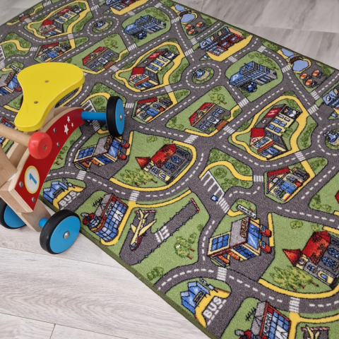 A gyerekeknek készült autópályás, utas, városos szegett szőnyegek vidám színei tökéletesen harmonizálnak a gyerkőcök szobájával. Tavacska, bolt, autómosó, repülőter, rendőrség, kórház és még sok más épület található a szőnyegen. Mintájának felfedezése egy