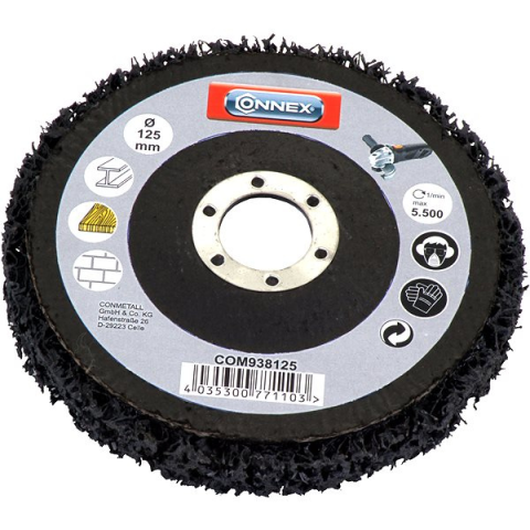 Csiszolókorong fa, fém és fal megmunkálásához - nejlon, 125 mm átmérő, 5500 ford/perc maximális sebesség, M14 rögzítés A kiváló CONNEX univerzális tisztítókorong 125 mm legfontosabb tulajdonságai Az erős CONNEX csiszolókorong többféle anyag köszörülésénél és megmunkálásánál lesz a segítségedre Durva felülete lehetővé