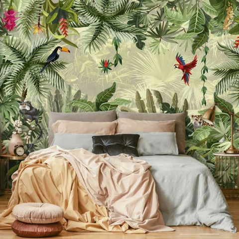 Egzotikus dzsungel mintás fotótapéta 254x184cm A kép 254 cm széles és 184 cm magas - 2 db 92x254 cm-es részből áll. A csomag tartalmazza a felrakási útmutatót és a tapétaragasztót. A termék a megrendelést követően kerül legyártásra, ezért a szállítási idő