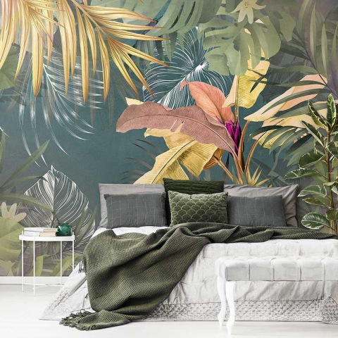 Pálmaág fotótapéta - Dzsungel mintás fali poszter A kép 368 cm széles és 254 cm magas. Növényi rost alapú vlies tapéta. Rendkívül dekoratív és tartós felületet biztosít. A csomag tartalmazza a felrakáshoz szükséges ragasztót. Más méretben is rendelhető