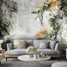 Szürke beton alapon zöld és arany monstera levél mintás fotótapéta A kép 460 cm széles és 300 cm magas - 5 db 92x300 cm-es részből áll. A csomag tartalmazza a tapétaragasztót és a felrakási útmutatót. Rendelés alapján gyártott termék, ezért a szállítási i