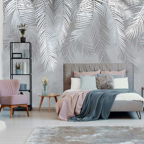 Szürke pálmalevél mintás fotótapéta A kép 312 cm széles és 219 cm magas - 3 db 104x219 cm-es részből áll. A csomag tartalmazza a felrakási útmutatót és a tapétaragasztót. Rendelésre gyártott termék, ezért a szállítási idő: 10-15 munkanap Ez a minta egyedi