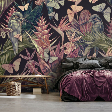 Trópusi madár és pillangó mintás fotótapéta A kép 254 cm széles és 184 cm magas - 2 db 92x254 cm-es részből áll. A csomag tartalmazza a felrakási útmutatót és a tapétaragasztót. Rendelésre gyártott termék, ezért a szállítási idő: 10-15 munkanap Ez a minta