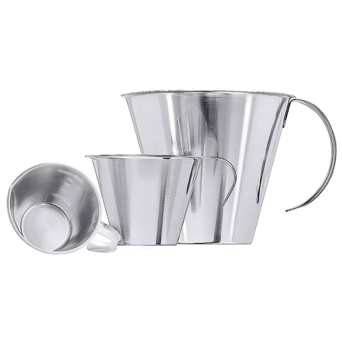18/10 rozsdamentes acélból, selyemfényű felület, belső skálával, nyitott markolattal, egymásba rakható.