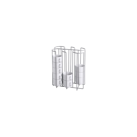 műanyag borítású acélhuzal, kiváló minőségű világosszürke polipropilén bevonat, ideális a halmozott poharak és csészék szállítására és tárolására, nagyon stabil minőség Magasság: 290 mm Hossz: 295 mm Szélesség: 195 mm Kivitel: 6 rekesz csészék/poharak számára, max. Ø 87 mm Anyag: Fém