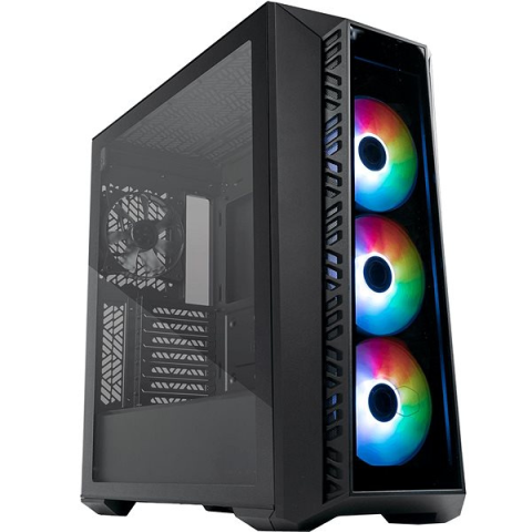 Számítógépház - ATX, mATX (Micro ATX), mITX (Mini ITX), eATX (Extended ATX) és CEB, 2× 3,5", 3× 2,5", USB 3.2 Gen 1, usb-c, fej-/fülhallgató/mikrofon és USB 3.2 Gen 2, 1x120mm és 3x120mm ARGB, processzor hűtő max. magassága 165 mm, videókártya max. hossza 410 mm, tápegység nélkül, edzett üveg oldalfal A remek Midi Tower nagyságú Cooler Master MASTERBOX 520 számítógépház ötletes dizájnt nyújt, amelyet fekete szín jellemez. Ezt acélból készült szerkezeten haszn