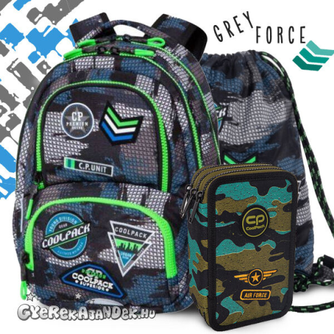 CoolPack Grey Force Iskolatáska Szett - Terepmintás, Hőtárolós Zsebbel 🎒 Ez a vagány CoolPack iskolatáska szett tökéletes választás alsósok számára! A szett tartalmaz egy ergonomikus iskolatáskát, egy felszerelt tolltartót és egy tornazsákot, mindezt...