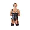 Fényes, mellemelős felső kézrögzítőkkel.Fényes hatású anyagból készülő harisnyatartós felső, fém gyűrűs megoldásokkal.A kebleket szabadon hagyó, mellemelős kialakítással, enyhén bélelt, merevített mellrésszel. Vékony, állítható váll- és harisnyatartó pántokkal.Egészen a hát közepén kar/csuklórögzítő pántok találhatóak. A pántok tépőzárral záródnak.Anyagban és színben maximálisan harmonizáló, fényes, szeméremnél teljesen nyitott tanga,