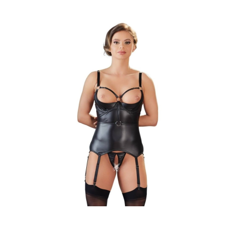Fényes, mellemelős felső kézrögzítőkkel.Fényes hatású anyagból készülő harisnyatartós felső, fém gyűrűs megoldásokkal.A kebleket szabadon hagyó, mellemelős kialakítással, enyhén bélelt, merevített mellrésszel. Vékony, állítható váll- és harisnyatartó pántokkal.Egészen a hát közepén kar/csuklórögzítő pántok találhatóak. A pántok tépőzárral záródnak.Anyagban és színben maximálisan harmonizáló, fényes, szeméremnél teljesen nyitott tanga,